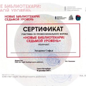 10 декабря детская библиотека (в лице заведующей Захаровой С. М.) приняла участие в качестве онлайн‑слушателя в VII Библиотечном профессиональном форуме «Новые библиотекари: Седьмой уровень», посвящённом развитию библиотек в цифровую эпоху. Организатор: библиотека имени Д. С. Лихачёва ЦБС Выборгского района Санкт-Петербурга.
